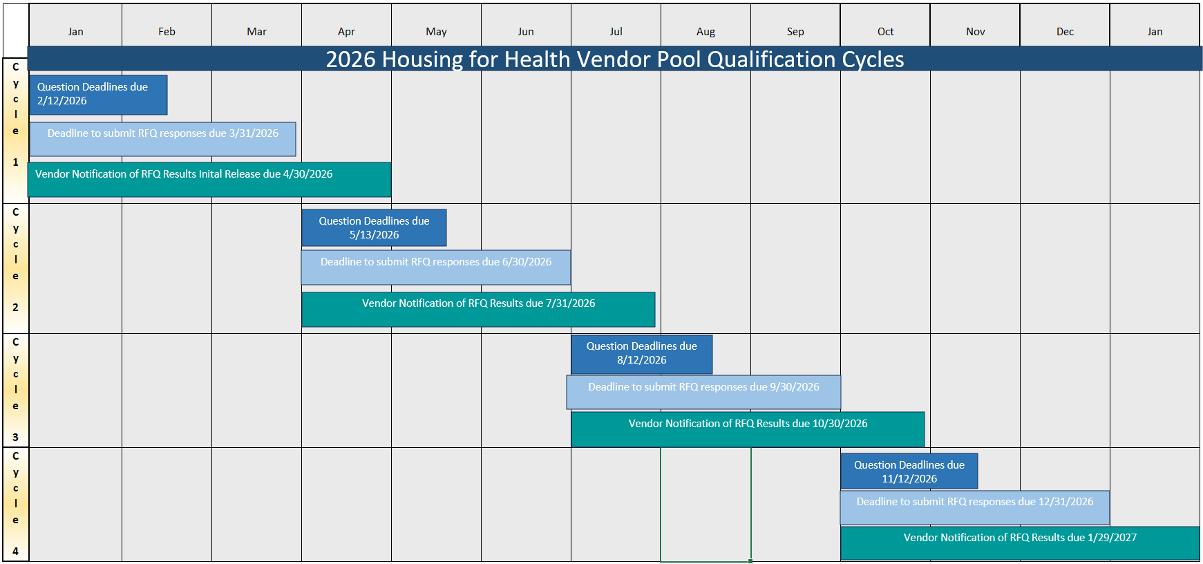 To be considered for the H4H Vendor Pool, please submit your Request for Qualifications (RFQ). All applicants will be reviewed by a team of County staff and consultants with extensive experience in health and housing-related services. Notifications regarding your qualification status will be sent by the Vendor Pool Contract Analyst.
